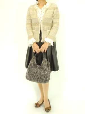 ニットジャケットには全く違くフェイクレザースカートを合わせるとメリハリが効いてスッキリ見えます!フェミニン度60%、エレガンス度40%。