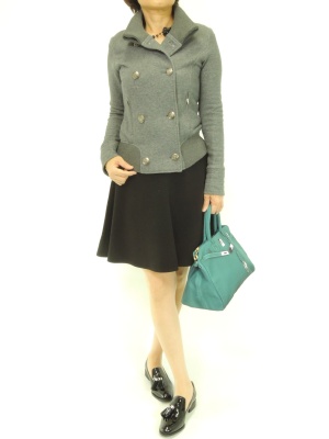 フレアーたっぷりのサーキュラースカートのトップスはコンパクトなジャケットでタイトにまとめて!スタイリッシュ度70%、フェミニン度30%。