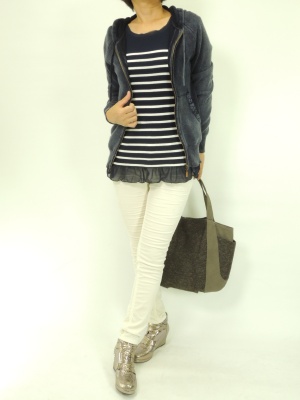 秋のマリンスタイルは素材感がポイント。ユーズド風のアイテムならこなれた感じに仕上がります!アクティブ度90%、フェミニン度10%。