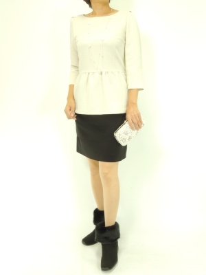 ぺプラムトップスはタイトスカートでスッキリ着こなして。足元パンプスでも素敵ですが、今年はショートブーツで決めたい!エレガンス度70%、スタイリッシュ度30%。