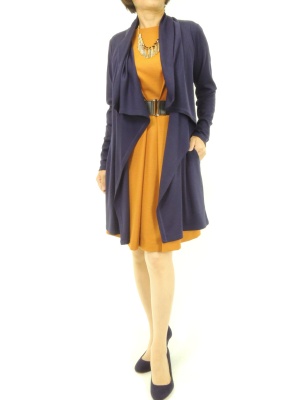 ワンピと着流しカーデのエレガントなコーディネート。オレンジ×パープルの反対色の組み合わせがおススメです!エレガンス度70%、スタイリッシュ度30%。