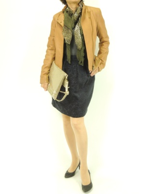 レザーのライダースジャケットは女らしく着こなしたい。ジャガードのタックスカートなら上品な印象に!スタイリッシュ度70%、エレガンス度30%。