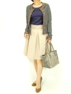 ふんわり広がるタックスカートはジャケットを合わせると、甘めのきちんとスタイルに!フェミニン度60%、エレガンス度40%。