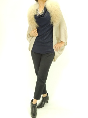 カジュアルなモモンガカーデもファー付きならエレガントに着こなせます!エレガンス度60%、スタイリッシュ度40%。