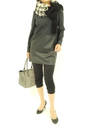 フェイクレザーを使った異素材ワンピは全身黒系でまとめてクールに。ファーマフラーでエレガントさをプラスして!エレガンス度60%、スタイリッシュ度40%。
