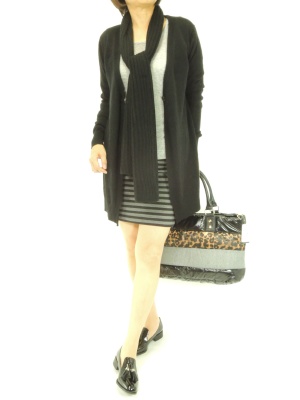 タイトスカートは黒とグレーでまとめてシックに着こなして。ロングカーデがミニスカートを大人っぽくまとめてくれます!スタイリッシュ度90%、アクティブ度10%。