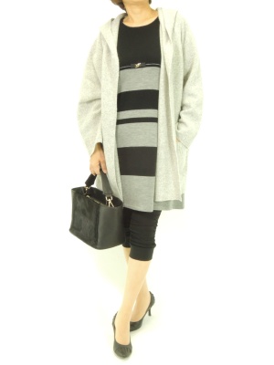 上品なニットワンピをビッグサイズのカーデとレギパンでカジュアルに着崩して。シックな色でまとめるとお洒落です!フェミニン度60%、スタイリッシュ度40%。