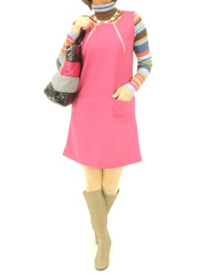 ピンクのノースリーブワンピとマルチボーダーで60年代みたいな着こなしもおススメ!フェミニン度80%、スタイリッシュ度20%。