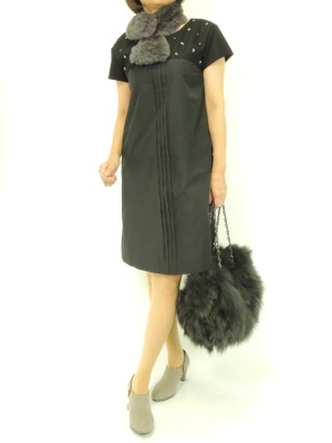 黒ワンピはファー小物でリッチに仕上げたい。足元には程よいボリュームのブーティーで!エレガンス度70%、スタイリッシュ度30%。