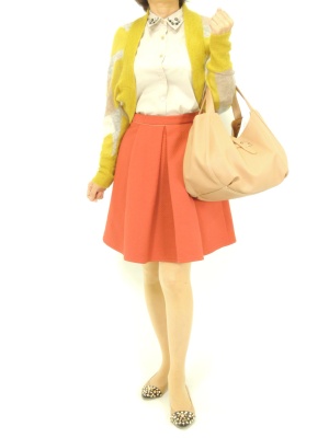 ふわっと広がるスカートにはトップスをインしてバランスよく。羽織り物はコンパクトにまとまるボレロを!フェミニン度90%、スタイリッシュ度10%。