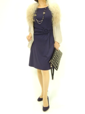 シンプルワンピをファー付きカーデとクラッチバッグで華やかに、カッコよく着こなしてみました!エレガンス度70%、スタイリッシュ度30%。
