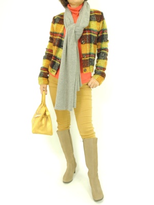 この冬注目のタータンチェックをアウターで取り入れて。明るい色合いでまとめると、イエロー系のチェックが浮かずにまとまります!スタイリッシュ度70%、フェミニン度30%。