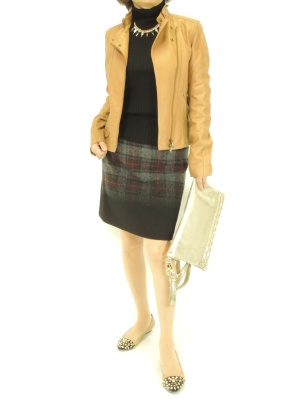 レザーのライダースジャケットは女らしく、ソフトに着こなしたい。でも小物だけはエッジの効いたものを選ぶとぐっとお洒落に!スタイリッシュ度80%、エレガンス度20%。