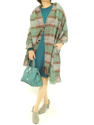 ブルーグリーンでまとめたコーディネート。ふんわりしたストールポンチョやだまし絵バッグで遊び心をプラスして!フェミニン度80%、スタイリッシュ度20%。