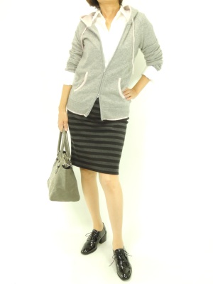 白シャツとペンシルスカートの辛口コーデをカシミヤニットのパーカで少し優しい印象に!スタイリッシュ度80%、フェミニン度20%。