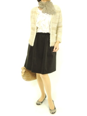 冬素材でまとめた上品コーデ。小さ目のファーで視線を上に集めてバランスよく!エレガンス度60%、フェミニン度40%。