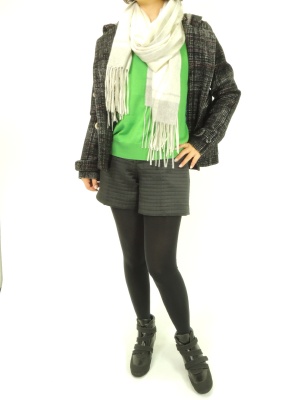 鮮やかなグリーンのニットを黒系コーデのアクセントに。インヒールスニーカーでカッコよく決めたカジュアルスタイルです!アクティブ度60%、スタイリッシュ度40%。