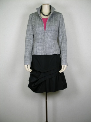 辛口ジャケットには甘口スカートがちょうど良いバランスです。パールのアクセサリーでグッとエレガントに!エレガント度70%、スタイリッシュ度30%。