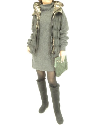 お袖が特徴的なワンピースにはダウンベストを合わせて。迷彩柄とクラッチバッグのグリーンがアクセントに!フェミニン度70%、アクティブ度30%。