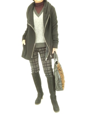 カジュアルアイテムのコーディネートですが、シックな色合いとタイトなシルエットでスタイリッシュな印象に!スタイリッシュ度80%、アクティブ度20%。