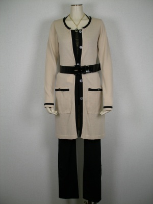 落ち着いたロングカーデェには、太ベルトでウエストマークするとカッコよく決まります。オフィスになじみながら流行りも押えたスタイル!スタイリッシュ度90%、エレガンス度10%。