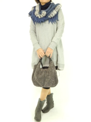 カジュアルなゆったりスエットワンピはスヌードで変化をつけて!フェミニン度60%、アクティブ度40%。
