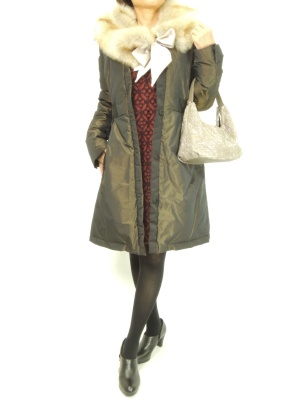 レースワンピとファーティペットでドレスアップしたときはダウンコートで少しハズすのがおススメです!エレガンス度60%、フェミニン度40%。