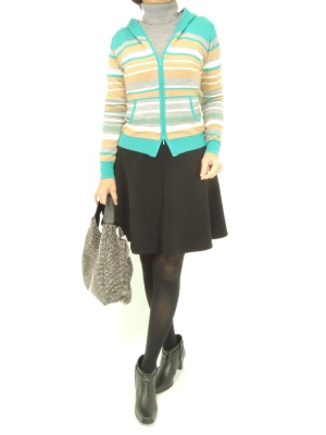 キレイ色のマルチボーダーのニット素材ならパーカもフェミニンな印象に。コンパクトなデザインなのでサーキュラースカートともよく合います!フェミニン度80%、スタイリッシュ度20%。