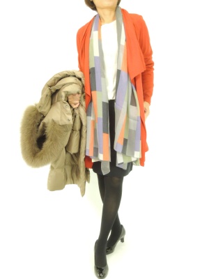 カーディガンのドレープに添うようにストールを垂らして、縦のラインを強調したコーディネート。羽織り物はロングコートがバランス良い!スタイリッシュ度80%、エレガンス度20%。