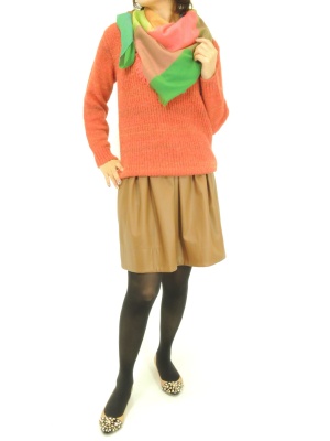 暖かなニットにクールなフェイクレザーを合わせる異素材MIXが今年らしいコーディネートです!アクティブ度60%、フェミニン度40%。