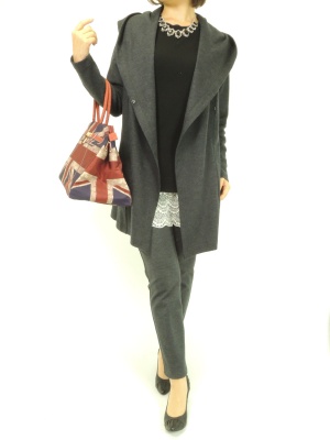グレーと黒でシックにまとめたコーディネート。ボリュームネックレスやだまし絵バッグで一癖加えると旬の表情に!スタイリッシュ度90%、エレガンス度10%。