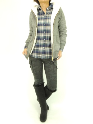 チェックと迷彩の柄ON柄もシックな色使いならしっくりなじむ!アクティブ度100%。