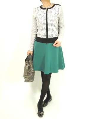 人気のサーキュラースカートにはコンパクトなトップスがよく合います。キレイなグリーンで春らしく!フェミニン度80%、エレガンス度20%。