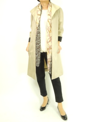 シンプルなスプリングコートはストールでアクセントを付けると華やかに!エレガンス度60%、スタイリッシュ度40%。