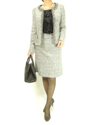 セレモニーにはきちんとしたツイードのスーツで。インナーは黒のフリルブラウスが上品でよく合います!エレガンス度90%、フェミニン度10%。