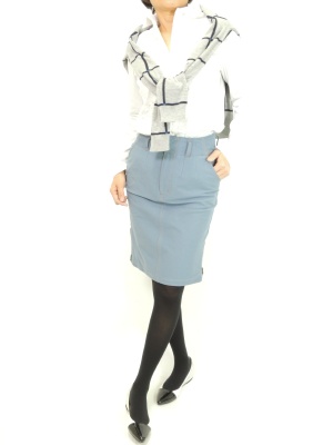 タイトスカートに白シャツをインしてスッキリと。ニットを肩掛けすると、さらにスタイルよく見えます!フェミニン度60%、スタイリッシュ度40%。
