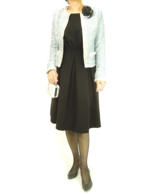 ツイードジャケットを羽織ればブラックワンピも華やかに。コサージュはワンピと色を合わせた黒をチョイス!エレガンス度80%、フェミニン度20%。