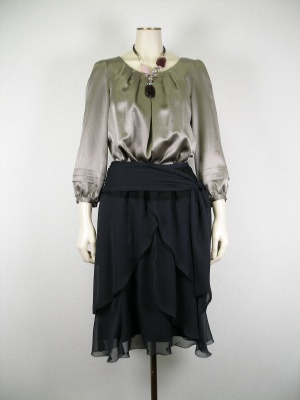 光沢のあるブラウス。本来ならオーバーブラウスとして着るものをインにして少しふんわり感を強調してみました。改まった席でのお食事に・・・。お座敷でも気にならないスカートです。エレガンス度90%、フェミニン度10%。