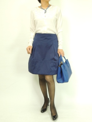カーディガンとスカートの清楚なコーディネート。素材感をMIXさせるがお洒落のポイントです!エレガンス度60%、フェミニン度40%。