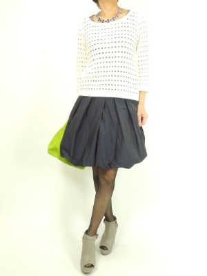 ワンピースにニットを重ね着したコーディネート。ビジューネックレスとボリューム靴で甘口スタイルも今年らしく!フェミニン度70%、スタイリッシュ度30%。