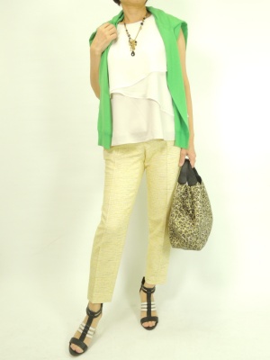 グリーンとイエローを効かせて春らしい印象に。重い色は使わず、軽やかに仕上げて!スタイリッシュ度80%、フェミニン度20%。