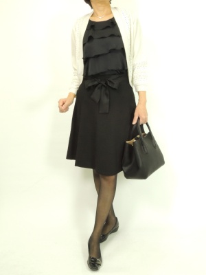 黒の上下にはニットのボレロを羽織ると優しい印象に!フェミニン度70%、エレガンス度30%。