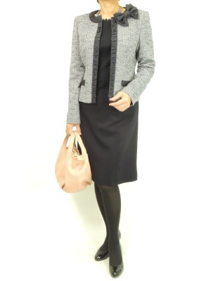 ネイビーのワンピースにはツイードのジャケットがよく合います。シックで上品なセレモニースタイル!エレガンス度90%、フェミニン度10%。