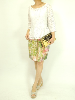 ぺプラムトップスとタックスカートで旬のコーディネートに。レースや鮮やかな色が春らしくてエレガントです!エレガンス度70%、フェミニン度30%。