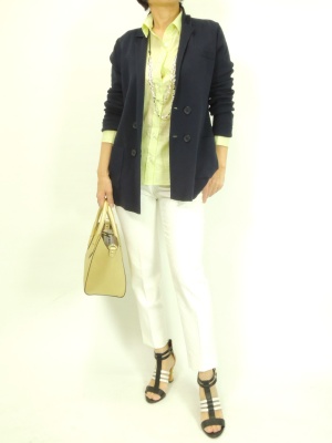 キリッとした通勤スタイルもニットジャケットなら固くなりすぎず、着心地も楽ちん。シャツのグリーンが映えるシンプルコーデです!スタイリッシュ度90%、エレガンス度10%。