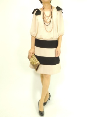 リボンが可愛いドッキングワンピはサラリと一枚で。ボリュームネックレスとクラッチバックでスパイスを効かせて!エレガンス度80%、スタイリッシュ度20%。