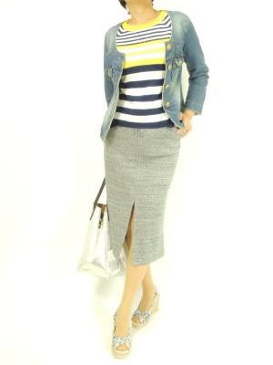 流行のスウェットスカートもスリット入りの膝下丈なら大人っぽい。トップスはコンパクトにまとめて!アクティブ度70%、スタイリッシュ度30%。