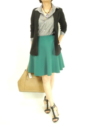 テーラードジャケットとシャツの定番辛口コーデもこの春はスカートを合わせたい。サーキュラースカートなら甘すぎず取り入れやすいはず!スタイリッシュ度70%、フェミニン度30%。