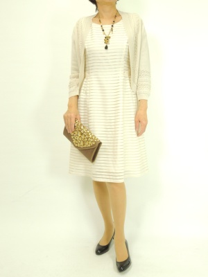 ライトベージュでまとめた上品なコーディネートはブラウンの小物でアクセントに!エレガンス度80%、フェミニン度20%。
