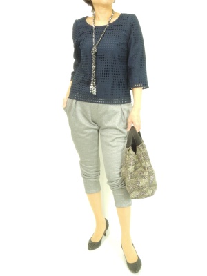 スウェットパンツはブラウスを合わせて女らしく着こなしたい!スタイリッシュ度90%、エレガンス度10%。